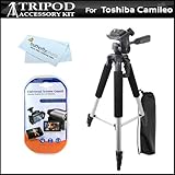 I got this tripod for use with a Toshiba Camileo H30 video camera and I am happy with the purchase. The tripod comes in a small carrying case with a nice strap. It has telescoping legs, so you can put it on the floor, or on a table. Fits my camera perfectly. Best price I could find. Very pleased.