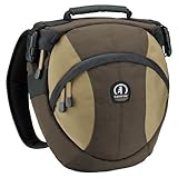 This bag holds my Nikon D5100 and two small lenses comfortably and slings over the shoulder. I've had it for quite some time now and it's holding up perfectly. I'd recommend it.